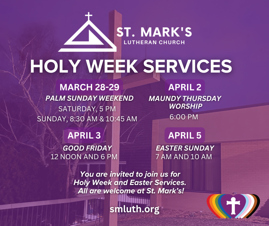 Join us at St. Mark's Lutheran Church as we journey through the week with Jesus — from the shouts of Palm Sunday to the tears of the tomb and the joy of Easter morning.